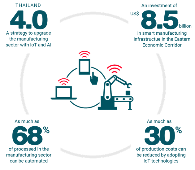 To escape the trap, the government has embarked on Thailand 4.0 by adopting automation, robotics and IoT technologies. The manufacturing sector has played a leading role in adopting IoT to improve its manufacturing efficiency and cut costs by up to 30%.