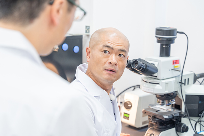 協創の森を進む、あばれる君を出迎えてくれたのも、ヘルスケア・バイオ分野で研究にまい進する先輩社員・柳川善光さんだ。敗血症という細菌などで感染する病気から多くの人々の命を救う検査技術の開発中で、さっそく自身の研究について切り出した。