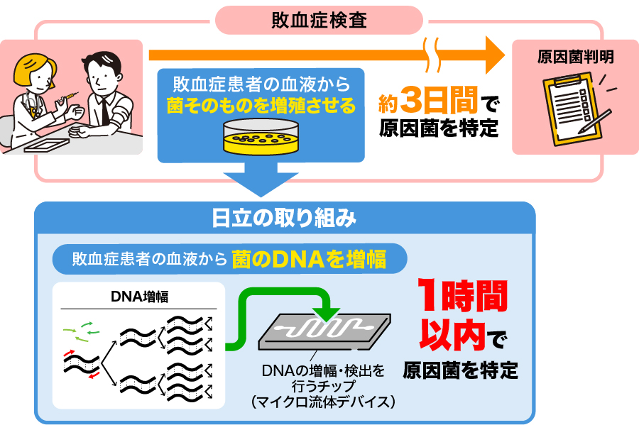 日立が研究を進める検査技術は、長時間かけて菌そのものを増殖させるのではなく、菌から抽出したDNAをPCR技術で増やして原因菌を突き止める手法だ。