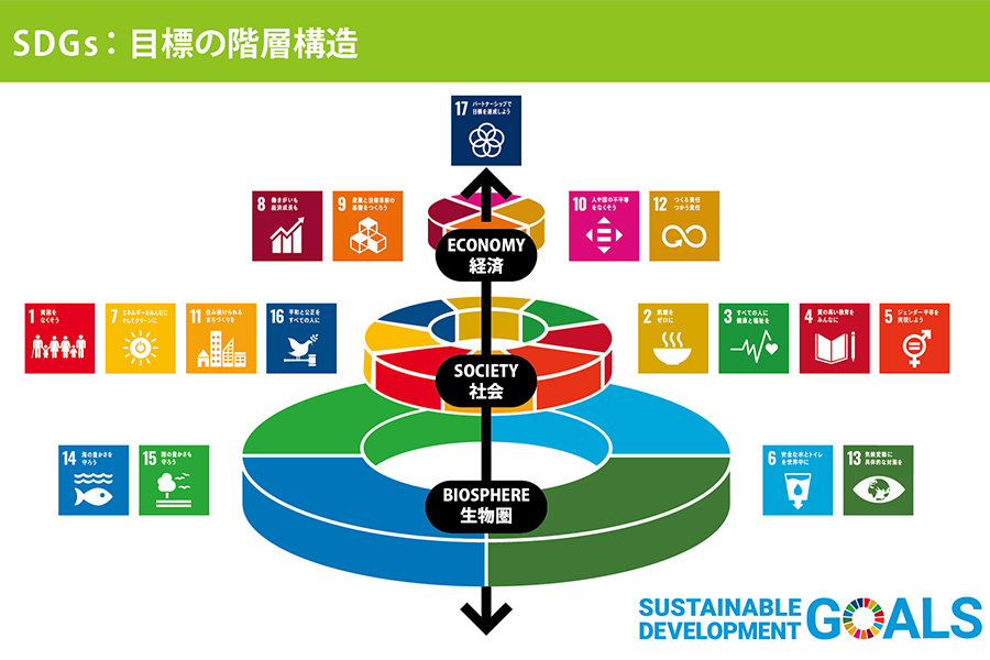 この3種の関係性は、図3にあるように、生物圏に関する目標がまず基盤としてあって、その上に社会、経済に関する目標がある、と考えることができます。一番下の生物圏を基盤として、その容量の範囲内に社会と経済活動が収まるべきであるというプラネタリーバウンダリーの概念が大きな影響を与えているのです。