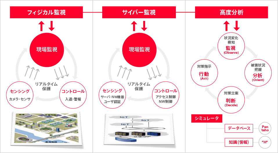 サイバー/フィジカルセキュリティを統合した監視を行い、それらから得られたデータを高度分析、これにもとづいた判断・行動を行うことで、継続的にセキュリティを強化できます。日立はその基盤となるIoTプラットフォームを「Lumada」として体系化。また計開発から運用保守までを一括して受託できる体制も整備し、サイバー攻撃へのお客さまの対応力向上を強力に支援します。